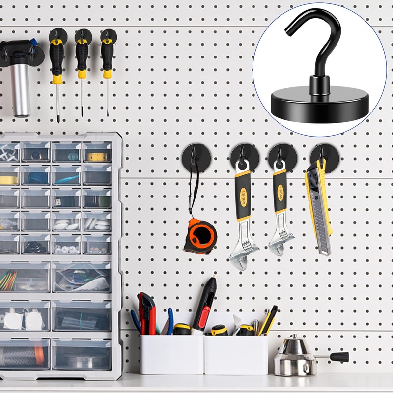 - 【WIDE APPLICATION】The 110 lb black magnetic hook is easy to install and use because of its simple structure. Used to fix, link and hang iron devices, tools and other objects (hats, keys, towels).