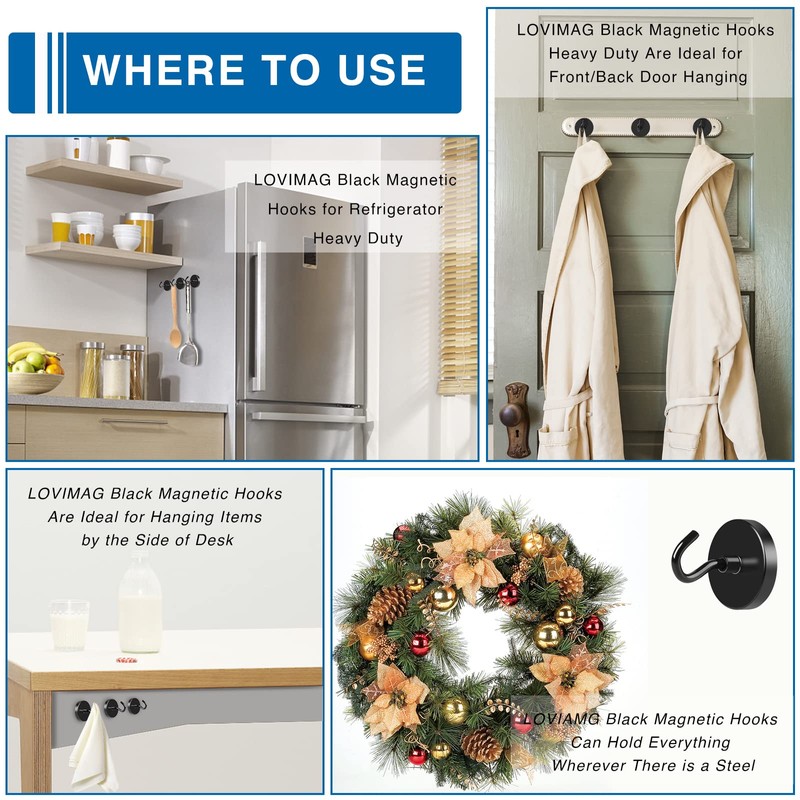 LOVIMAG Black Magnetic Hooks Heavy Duty, 110Lbs Strong Neodymium Magnet Hooks with Epoxy Coating for Home, Kitchen, Workplace, Office etc-4 Pack