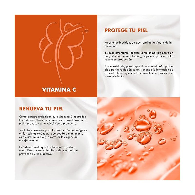 • ✅ Crema antiedad - su formulación con vitamina C favorece la síntesis y formación de colageno, frenando el envejecimiento