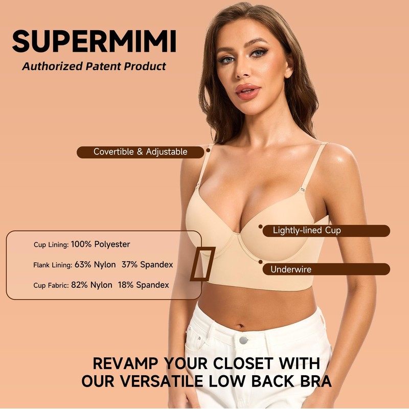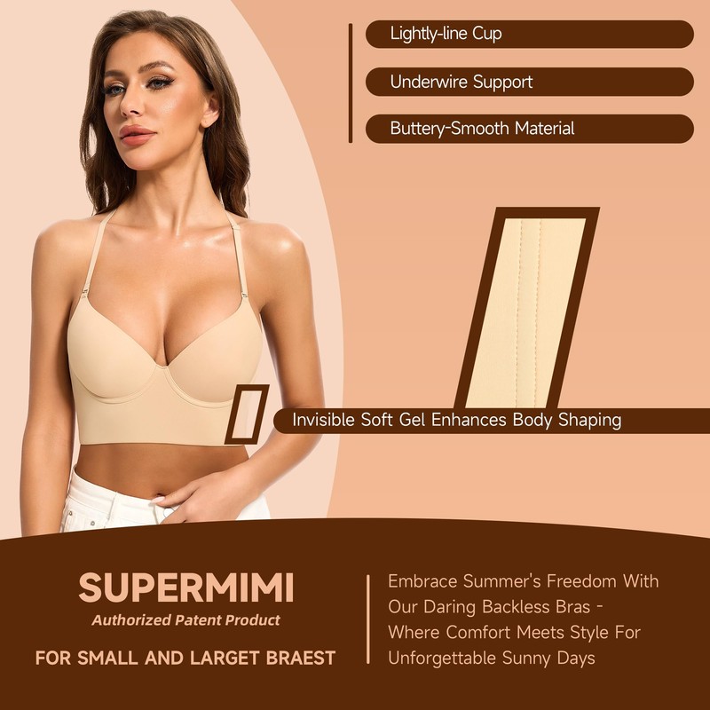 - INVISIBLE UNDERWIRE BACKLESS BRA - crafted from a mix of 82% Nylon and 18% Spandex, providing a lightweight and moisture-wicking feel. The cups are lined with 100% Polyester.