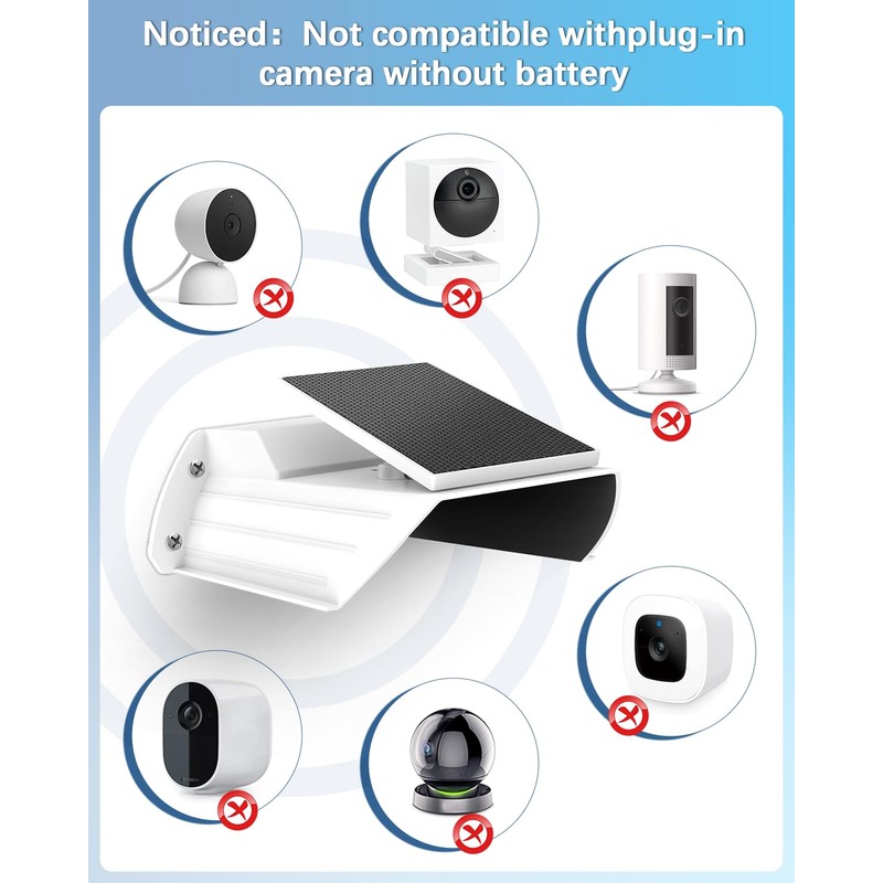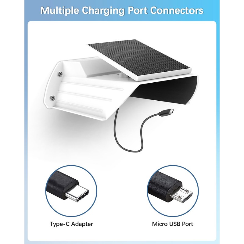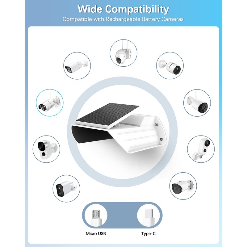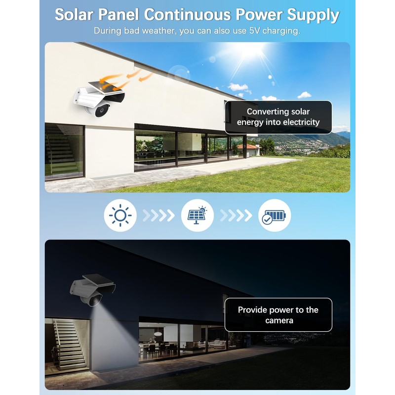 - 【Important Notes】This solar panel kit does not support continuous 360-degree rotation. It offers solar charging or 5V DC charging (initial setup requires about 4 hours of 5V DC charging). Please note, the charging function is not compatible with outdoor plug-in security camera
