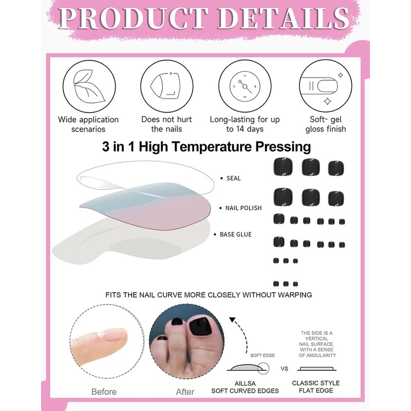 - Easy to use: these toenails can be easily worn without professional help. Simply clean the natural nails, apply glue and stick the false nails