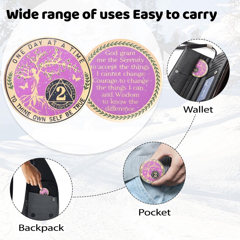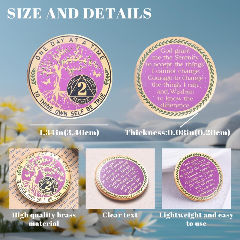 - 2 Year Sobriety Coin: Celebrate two years of sobriety with our beautifully designed AA medallion. This sobriety coin is a meaningful gift for women, symbolizing their strength and dedication to a sober life.