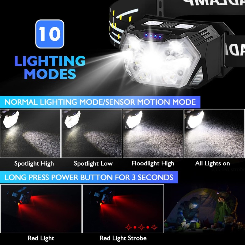 • 10 Modes and Motion Sensor:The headlamp flashlight has 10 modes to meet all your needs.①6 key modes, you can switch Spotlight High, Spotlight Low, Floodlight High, All Lights on, (Long Press 3 seconds→)Red Light, Red Strobe Light. ②4 motion sensor modes, you can easily turn the lights ON/OFF by waving your hand.