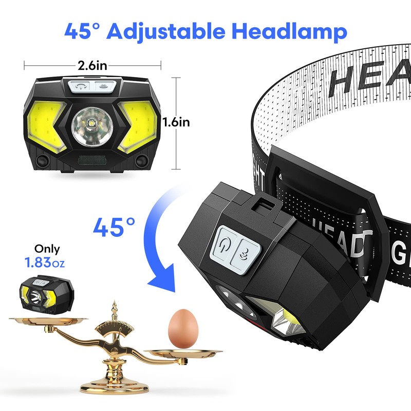 - Ángulo ajustable de 45° y ligero: con el fin de aplicar diferentes escenarios de uso, estas luces de cabeza para frente utilizan un diseño de ángulo ajustable de 45°. Esta función puede resolver la mayoría de tus problemas de uso, lo que es muy conveniente. Pesa solo 1.8 onzas, apenas lo notarás.