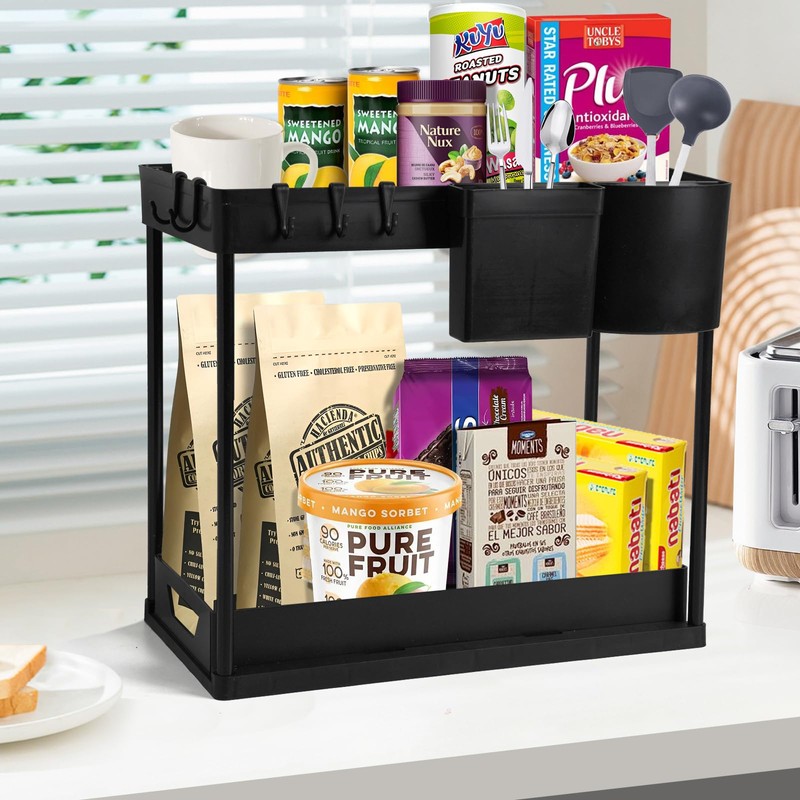 - Full Accessories & Expending Storage - The 2 tier sliding pull out cabinet organizer with 4 additional hanging cups and 10 detachable hooks, you can organize small items and it allows for maximizing the use of vertical space, ensuring that no corner goes unused