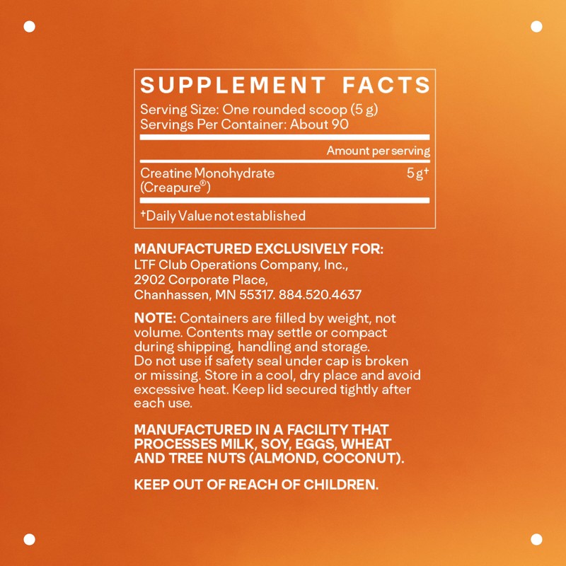 LTH's Creatine Monohydrate is a premier dietary supplement for those seeking superior athletic support. The pure, no-bloat formula makes it easy to incorporate into your daily routine, supporting your journey towards muscle support and overall performance.* Creatine Monohydrate is also NSF Certified for Sport.By supporting natural energy processes, LTH's creatine supplement helps sustain your workouts and daily activities with sustained vigor. Whether you're pushing through intense training sessions or striving to stay sharp, Creatine Monohydrate is your reliable partner.Our vegan-friendly formula caters to plant-based lifestyles without compromising on effectiveness. Embrace a supplement that aligns with your values and supports your body's natural processes, helping you achieve your health and performance goals with confidence. Elevate your fitness journey with a creatine supplement that prioritizes quality, efficacy and your overall well-being.*Our supplement line started over 20 years ago to provide a trusted, quality option when clean, effective product were nearly impossible to find. And this same passion to support wellness, fitness and health continues to fuel everything we do.Today, LTH is an expansive ecosystem of programs, offerings and amenities that helps members do what they're passionate about. We do research, ask questions and provide our personal recommendations on what we love, trust and use ourselves. It's a place where goals are reached, connections made, and potential realized.