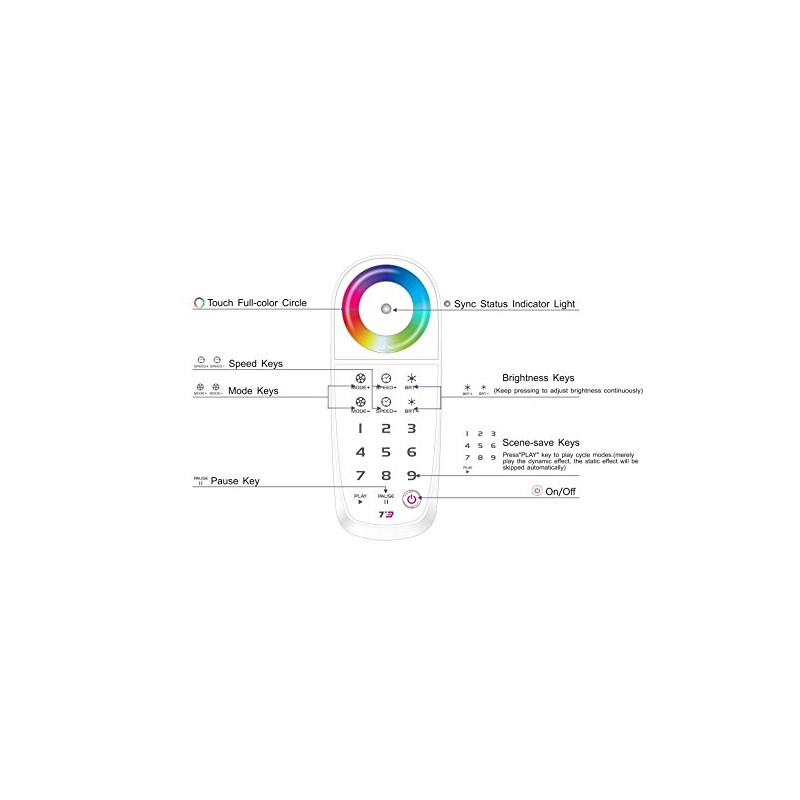 - Remote controller adopts the capacitive touch control technology on the wheel, make the dimming more intellectualized and humanized.The remote control built-in sync-status indicator, which can show the bright status of the LED synchronously.