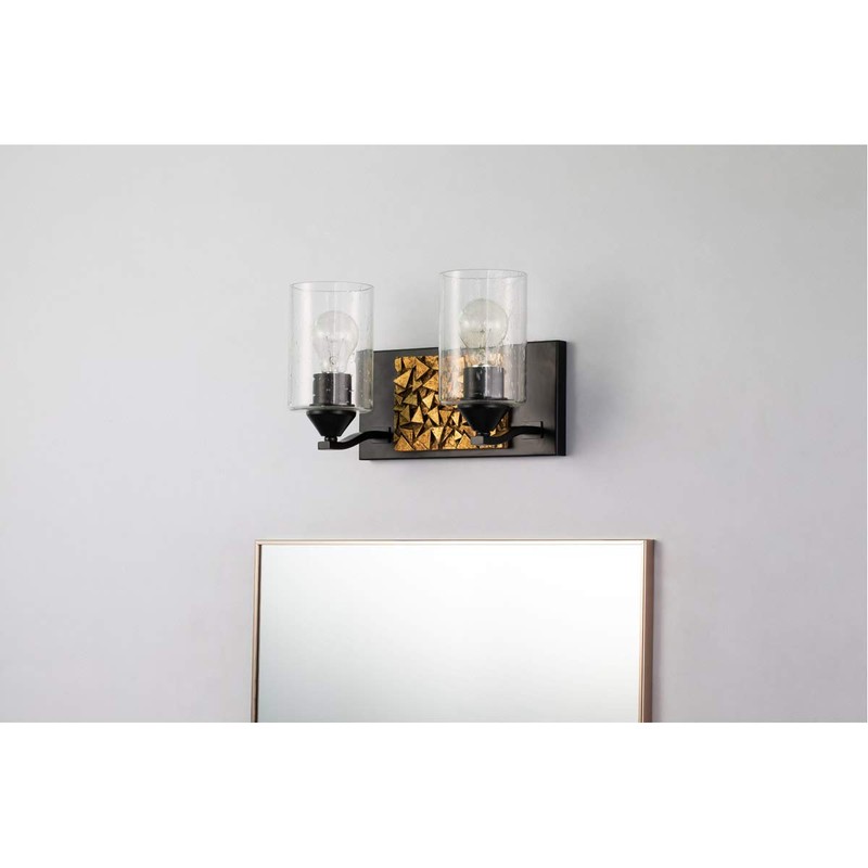 - Clean lines and timeless design this double vanity light is perfect for brightening your bathroom space giving it texture and dimension. Featuring a clean-cut rectangle backplate with textured traditional shapes, simple curved arm and a unique two-toned finish of matte black and antique gold. Showing off its contemporary side, this 2-light bathroom light uses a cylinder shaped clear seeded glass to bring attention to the mix of texture and details that come together in our Bocage collection