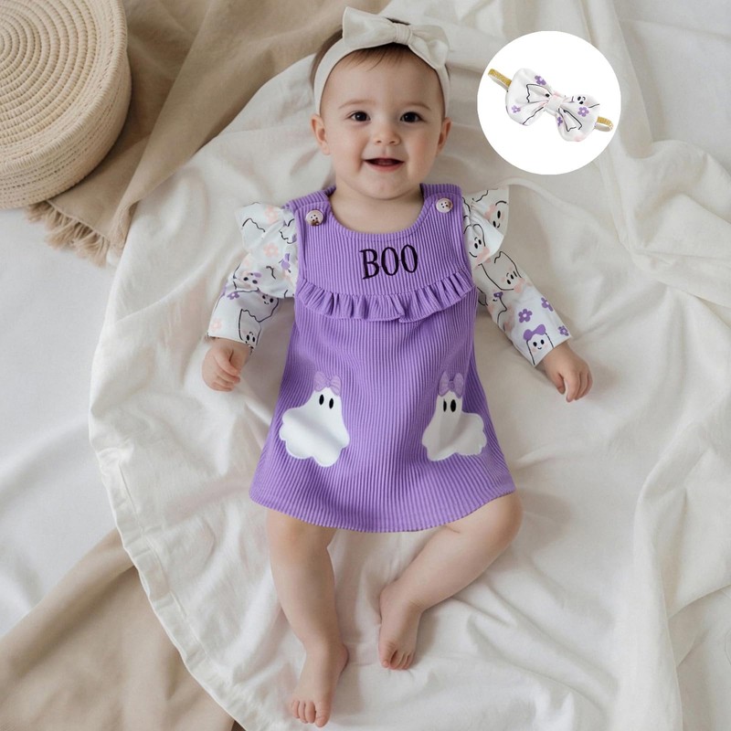 Lucikamy My First Christmas Baby Girl Outfit Long Sleeve Romper Tank Overall Dress Headband Winter 3Pcs Clothing Set (Purple Ghost-W, 0-3 Months)