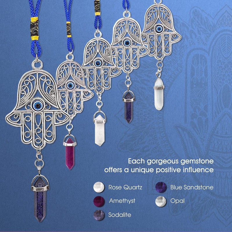 - MULTI-PURPOSE ORNAMENT: Enhance your surroundings with this exquisite Ornate Silver Hamsa Hand featuring a Amethyst gemstone and a captivating Blue Evil Eye at its center. Hang it anywhere - in your car, home, or office - for protection, blessings, and positive energy. Makes a fantastic gift for any occasion. The beautiful blue and silver design measures 1.8 inches by 9 inches, making it a perfect size for various settings.