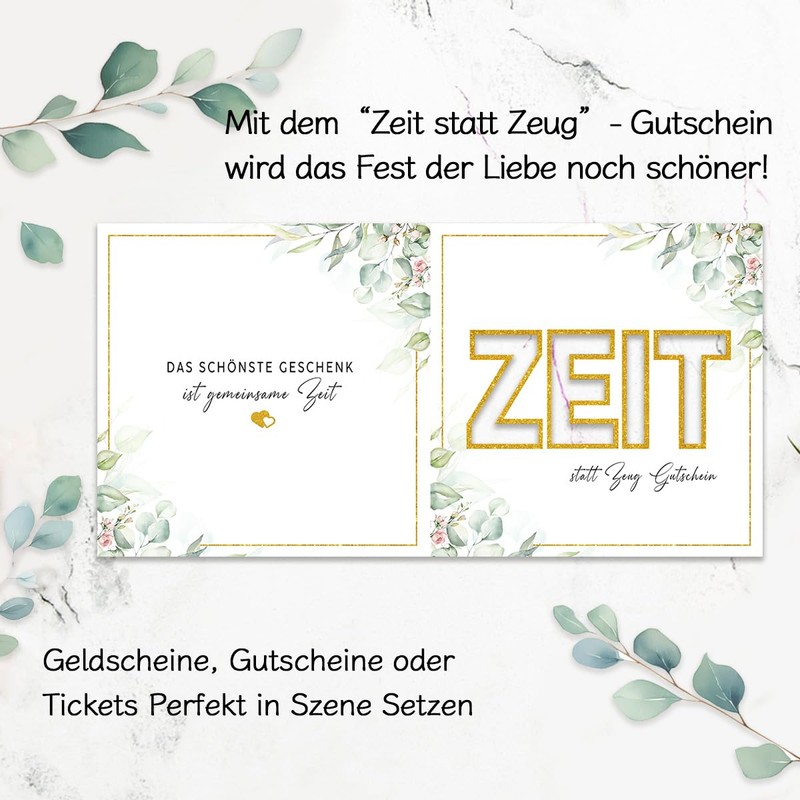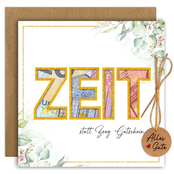 - Time instead of stuff voucher money gift packaging: 1 x eucalyptus leaves ZETT hollow folding card, 10 x transparent stickers, 1 x envelope, 1 x label "Alles Gute ", 1 x hemp rope.