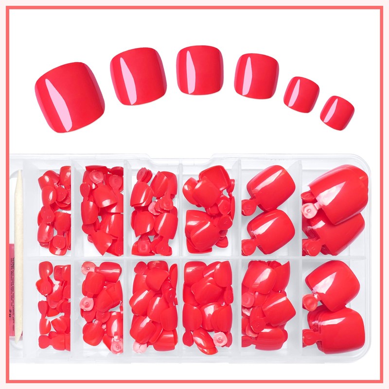- Red press on toenails kit: Fake toe nail press ons set come with 168pc red toe nail tips in 12 different sizes, 5 sheets adhesive tabs, 1tube nail glue, 1pcs nail file and 1pc nail stick. Toenail press nail kit with nail glue and basic nail tools to manicure,enough quantity toe press on nails short square shape with multiple sizes for kids, teen girls and women. Press on nails for toe are prefect fake toenails kit for you to DIY quick at home pedicure with your family and friends.