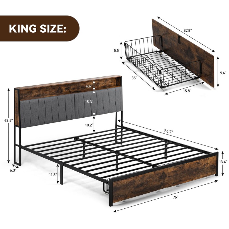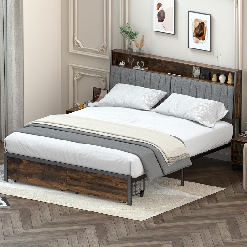 LUCKLIFE Bed Frame with 2-Tier Storage Headboard,Platform Beds with Drawers,Built in Charging Station&LED,Noise-Free,No Box Spring Needed (King (U.S. Standard))