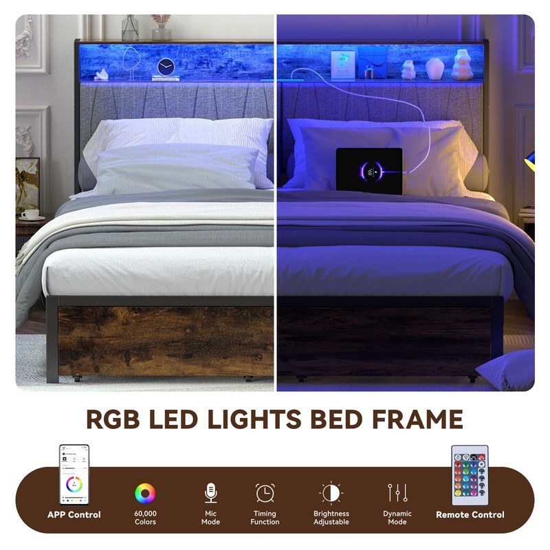 - 【Vibrant LED Lighting】Equipped with RGB LED strip lights,this bed frame offers adjustable colors and modes controlled via an app or remote,allowing you to create the perfect ambiance for any occasion,adding a modern,vibrant touch to your space