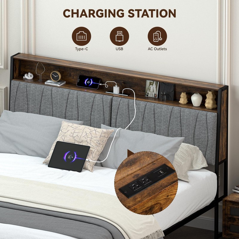 - 【Convenient Charging Station】The headboard is fitted with two AC outlets,one USB port,and one Type-C port,enabling you to charge multiple devices like phones,lamps,or other electronics simultaneously.Enjoy the ease of access to all your charging needs in one place