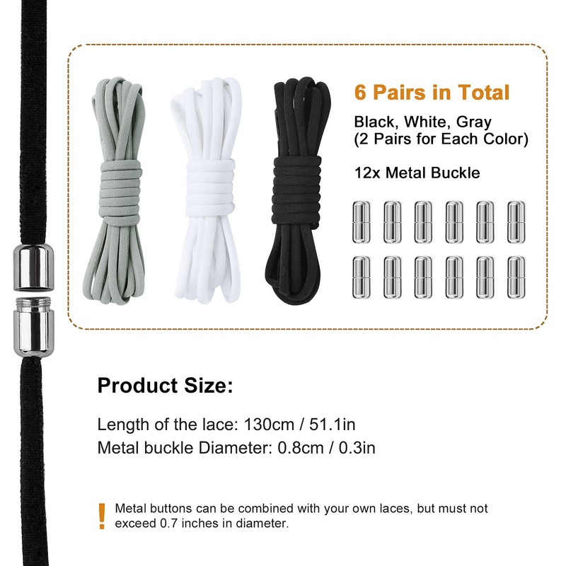 - 【Enough Quantity】You will receive 6 pairs elastic lock shoelaces + 6 pairs metal capsules,2 pairs black, 2 pairs gray, 2 pairs white(each pair individual packaged), the length is about 130cm/51.1inch, which can satisfy your daily replacing.