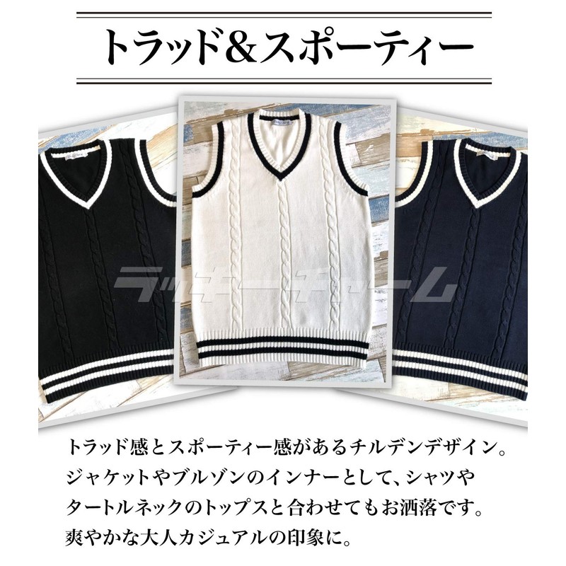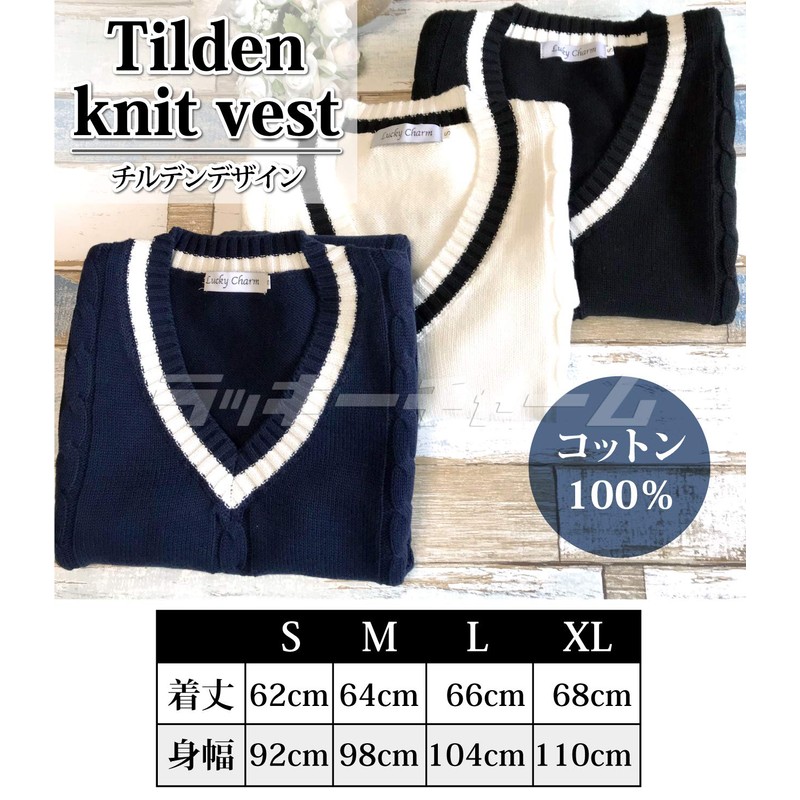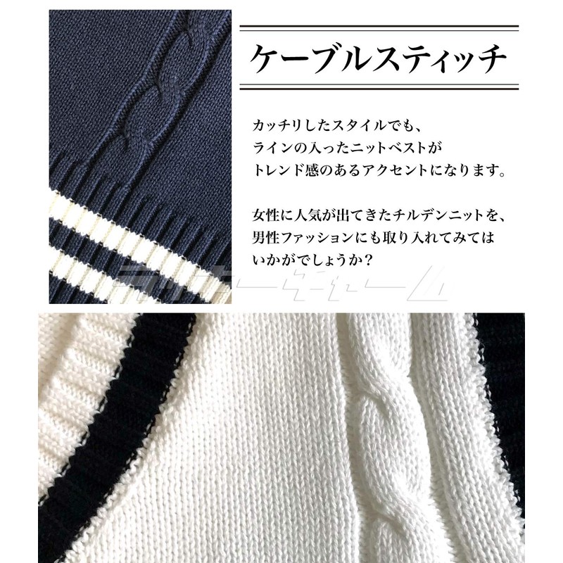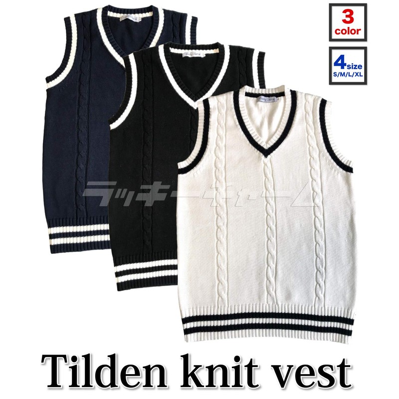 - A v-neck knit vest with cable stitching. Tilden design with traditional and sporty feel. It can be worn as an inner layer of a jacket or blouson or paired with a shirt or turtleneck top. Gives a refreshing adult casual impression
