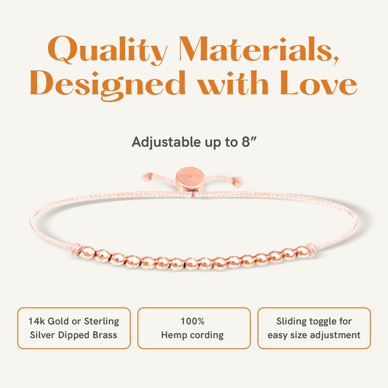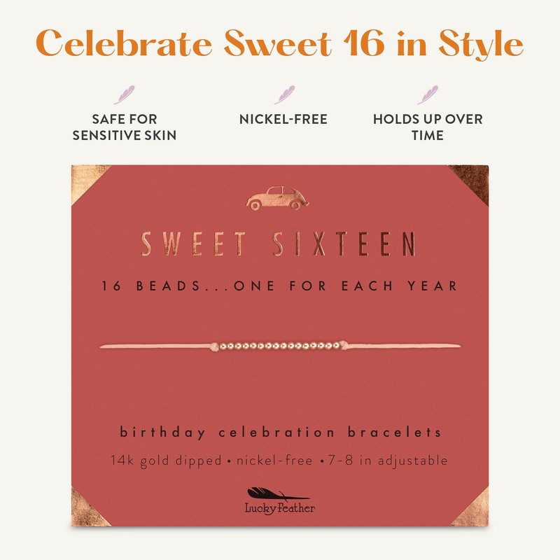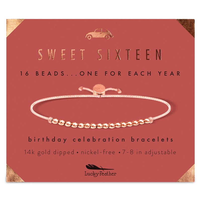 Lucky Feather Sweet 16 Gifts for Girls; 16th Birthday Bracelet Gift Idea for 16 Year Old Girls with 14K Rose Gold Dipped Beads on Adjustable Cord