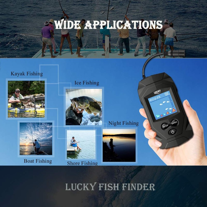 - Lucky New Arrival Fishing Fish Finders: This portable fish finders detects and shows fish location with water depth, short & tall weeds, sand & rocks. The color LCD display of the kayak fish finder is visible under sunshine. Backlight enable the fishing sonar for night fishing.