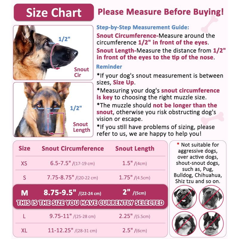 - Dog Muzzle Medium Sized Dogs: Size M fits for dogs with snout circumference between 8.75"-9.5", and snout length longer than 2". The muzzle for medium sized dog is suitable for Beagles, Border Collies, etc. Note: ①Measure your dog's snout datas as shown in the size chart or the video before choosing the size(The snout circumference is the key to choose sizes). ②If between sizes, SIZE UP! ③Not suitable for aggressive dogs, highly anxious dogs, short-snout dogs, flat face dogs