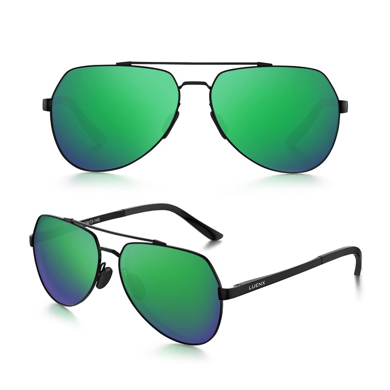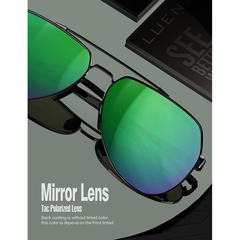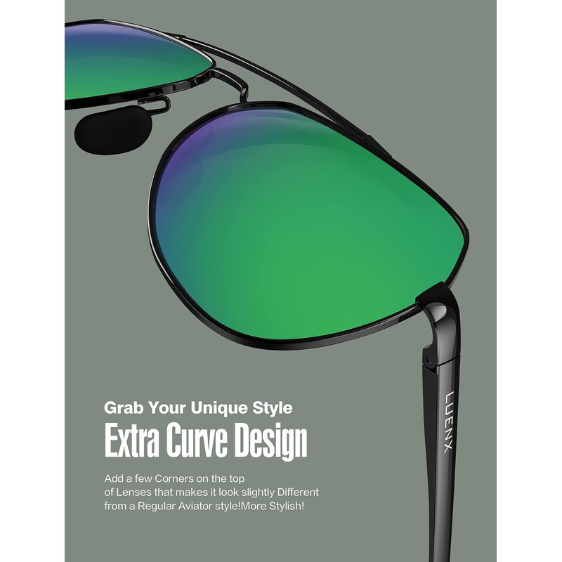 LUENX Men Women Aviator Sunglasses Polarized Shades Flexible Spring Hinge - Mirrored Green Lens Black Metal Frame Large 60mm