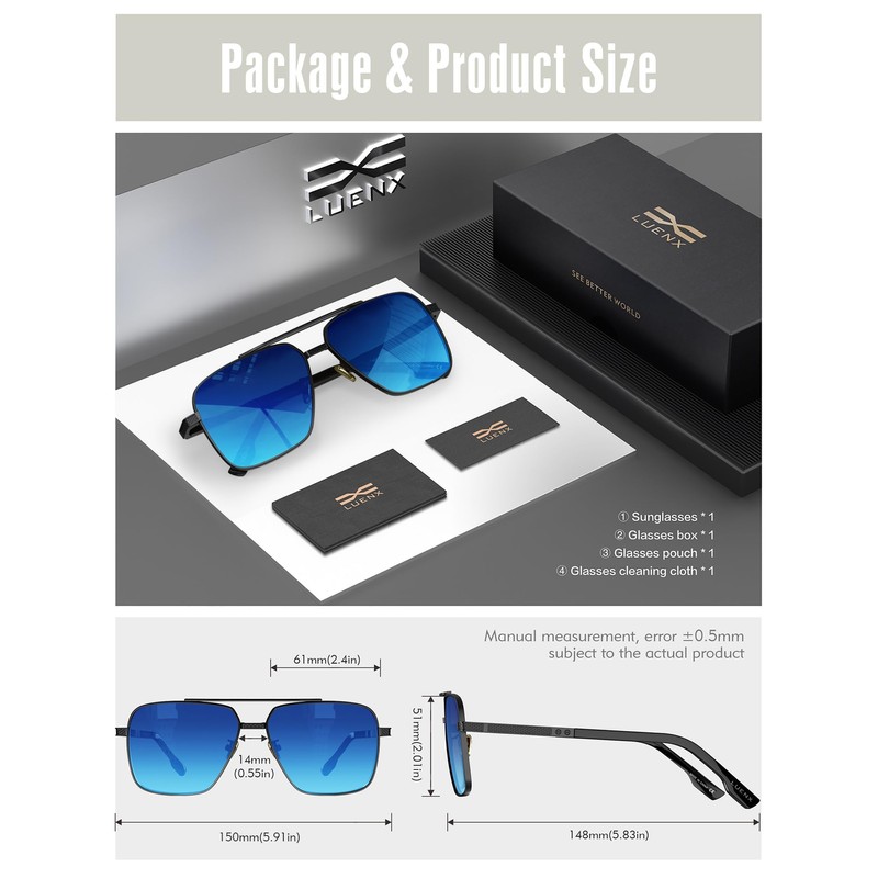 LUENX Polarized Square Aviator Sunglasses for Men Rectangular Mirror Dark Blue Lens Black Frame 61MM - UV 400 Protection
