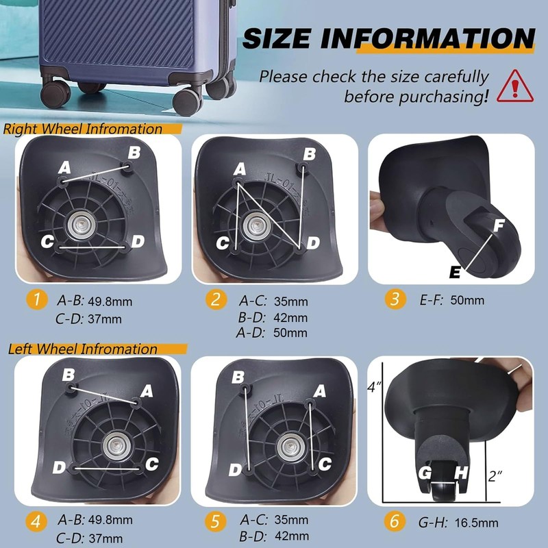 - Compatibility: these luggage wheels are not universal. Please compare the shape, structure and dimensions of your original wheels with our suitcase replacement wheels before purchasing. Please note the 2nd Product image.If your luggage wheel does not match the picture, the wheel will not fit