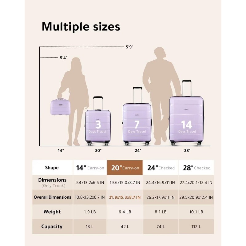 - Stylish and Durable: Crafted from premium PP materials, this ultra lightweight luggage is shielded from impact. Carry on suitcase remains sleek and scuff-free, exuding elegance wherever you go.