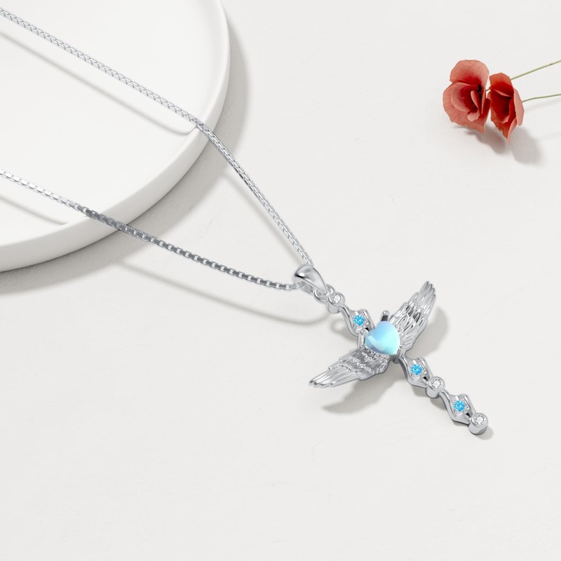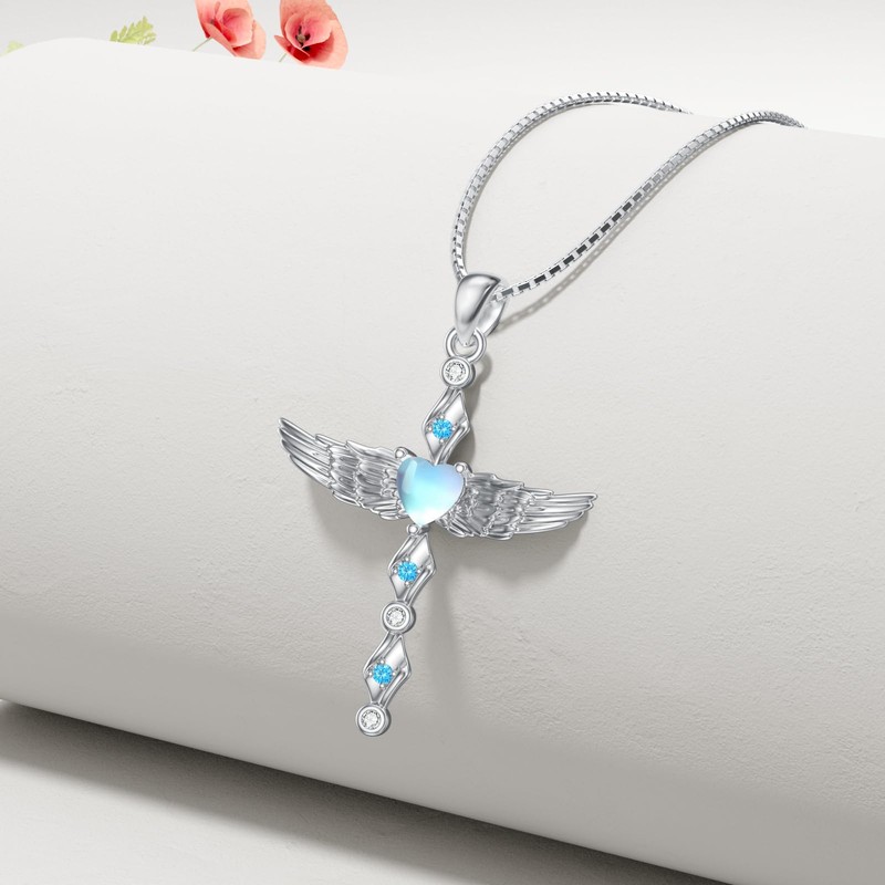 LUHE Moonstone Cross Necklace for Women 925 Sterling Silver Angel Wings Pendant Necklace Cross Jewelry Gifts