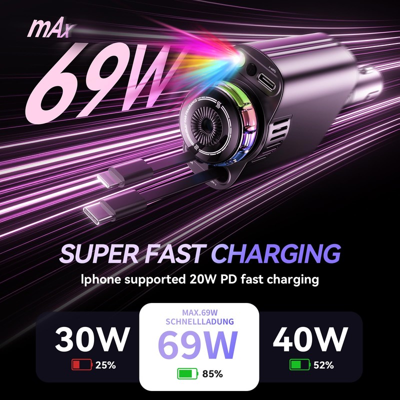 - Fast Car Charger: Professional-grade car fast charger with PD3.0 delivers 30W type C output and 15W USB-C + 15W lighting retractable car charger cord. Charges iPhone 16 /16 Pro. Car Cell Phone Charger is designed for 12V car cigarette lighter sockets compatible with all 12V-24V vehicles including trucks/RVs. Features temperature control + short-circuit protection. Perfect companion for iPhone 15/14 series and Android .