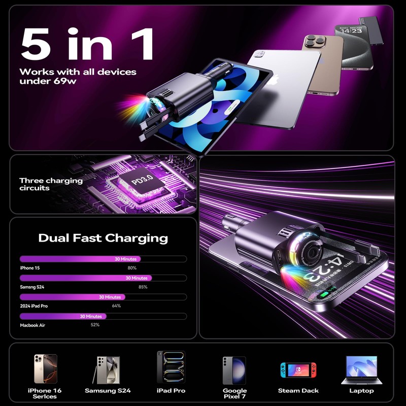 - Retractable Car Charger: Tangle-free charging solved! This retractable car charger stores 31.5" Apple lighting/Android cables that self-retract. Charges iPhone 16/15 and Samsung Galaxy S24 simultaneously via USB-C (15W) + USB-A (15W). Built-in voltage stabilizer prevents overcharging.Retractable dual-dable charger organize your cockpit clutter-free!