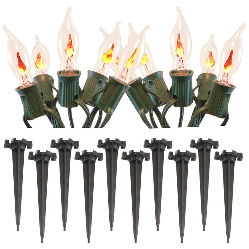 Welcome Trick or treaters & party guests with flickering orange electric pathway lights. They are weather resistant & can be enjoyed throughout the entire Halloween season. Simply stretch the 30' electric cord & position each of the C7- 5W light bulbs in each anchor stake. Perfect Halloween accent lighting for driveways, walkways, sidewalks or entryways.
