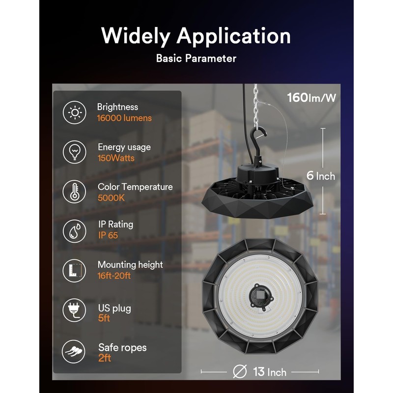 - Easy Setup for Diverse Uses: Install these high bay LED lights in just 3 minutes with no hassle. Including a 5-foot power cord, a standard US 3-prong plug for immediate plug-and-play use, a safety rope for secure installation, and a portable hook for added convenience. Ideal for a range of high bay lighting needs, these lights are perfect for industrial settings and commercial spaces, such as warehouses and factories, retail stores and shopping centers, barns and stables, garages and workshops, gyms and indoor courts, outdoor and indoor parking areas. Obvious, Lumary high bay LED lights are the smart choice for any environment requiring efficient and powerful lighting