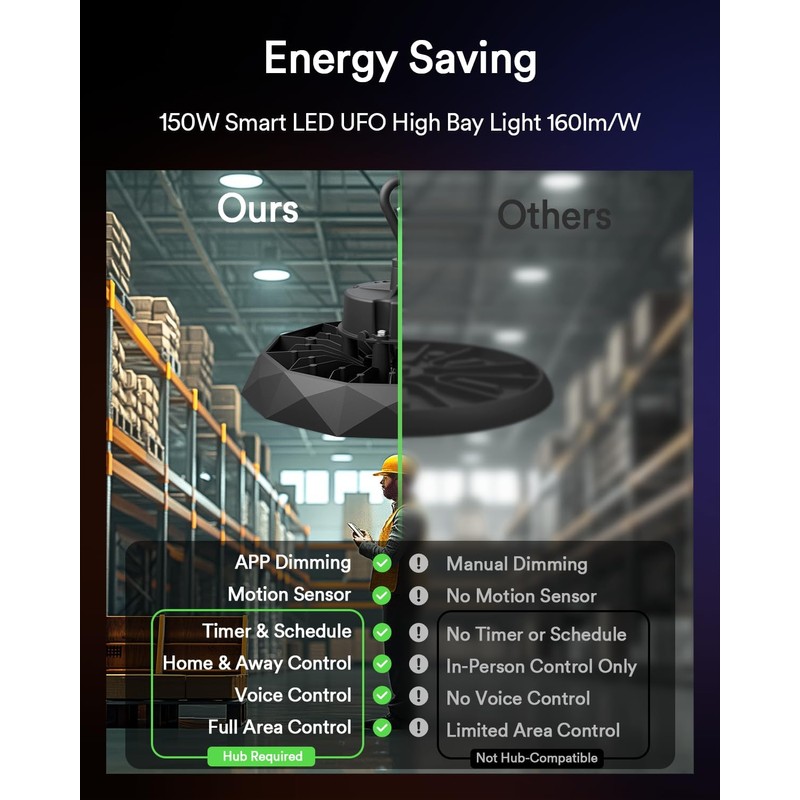 - Effortless Home & Away Control - Whether you're at home or away on vacation, Lumary smart UFO high bay lights can be controlled remotely. Manage your shop, barn, basement, gym, warehouse, showrooms, and logistics centers with ease via hub L-GW0A1. No worries forgot leave the lights on—simply turn them off remotely. Save energy, reduce costs, and enjoy the convenience of smart lighting that adapts to your lifestyle. Seamless smart home, perfect for those who value both efficiency and the latest in home automation technology