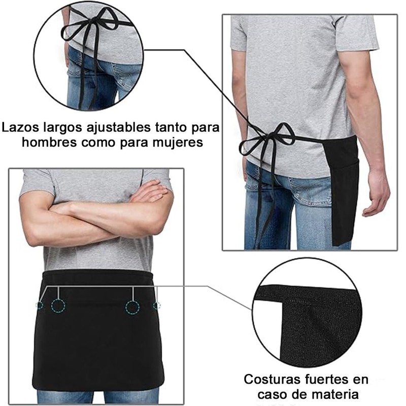 A diferencia de los delantales con peto largo, los delantales de cintura no protegen tan bien la parte superior del cuerpo, pero su sencillez, pequeño tamaño y sofisticación los convierten en los favoritos. Proporcionan la máxima comodidad a los camareros mientras trabajan de un lado a otro en el comedor. Este estilo de medio delantal es perfecto para camareros o camareras.