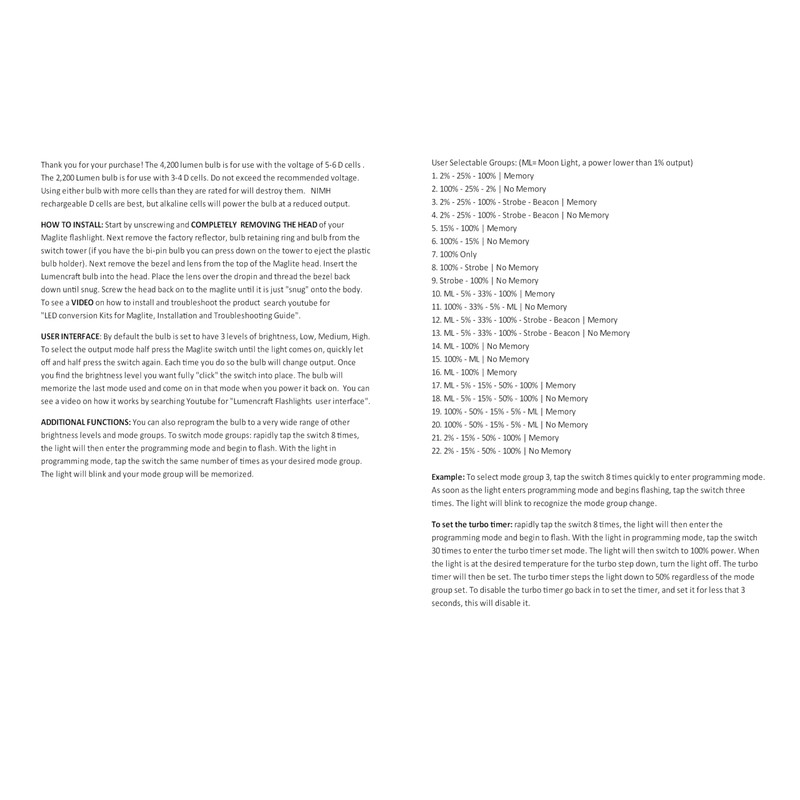 USER DEFINED MODES: By default the bulb is pre-programmed to be a simple easy to use 3 mode H,M,L with memory. However if you want to you can change it to have more or less output modes, and/or a strobe function. If you don't want additional features no programming is needed (See photos for detailed instructions).