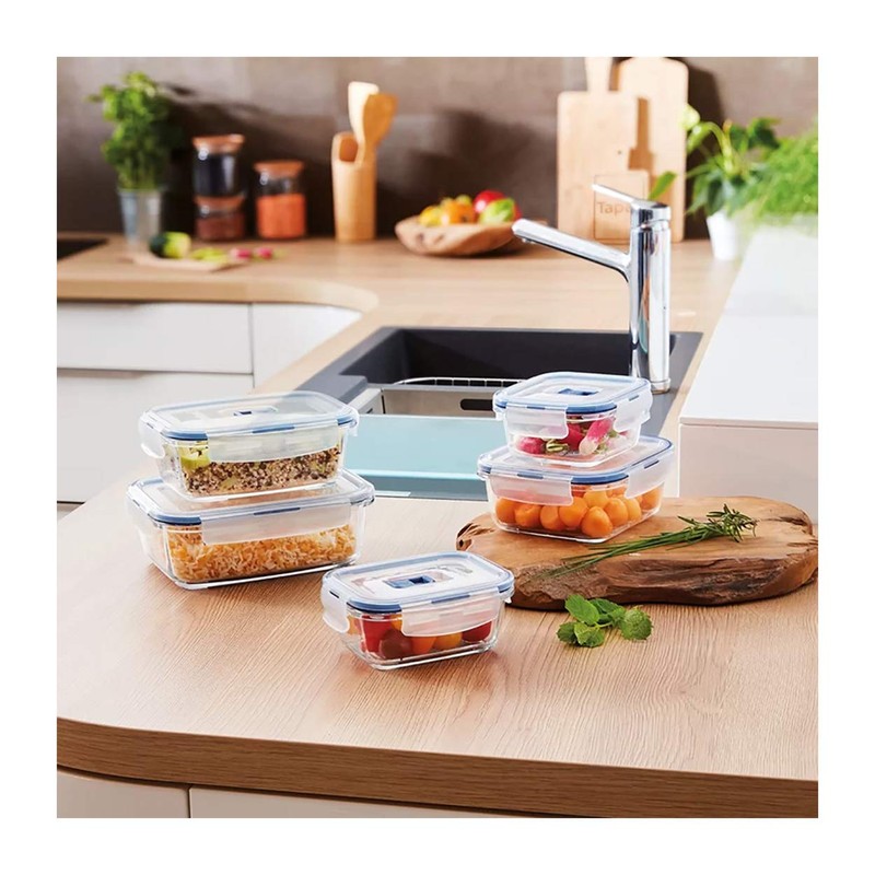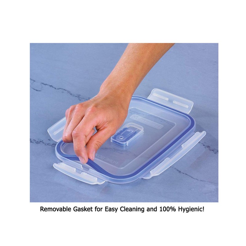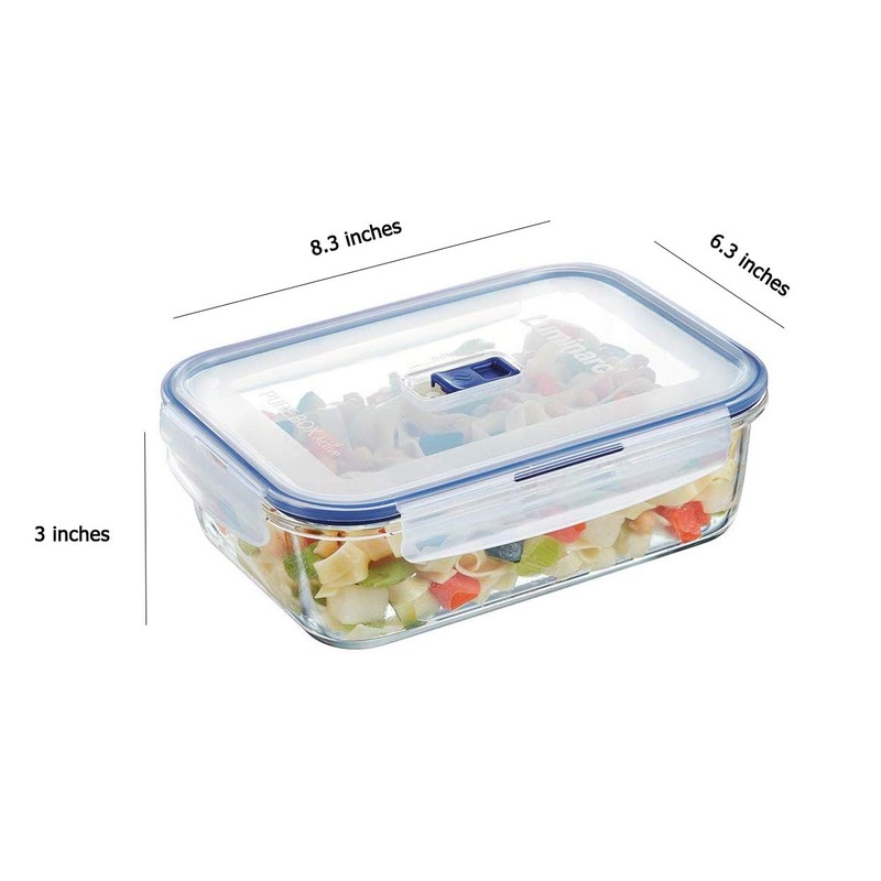 PRODUCT: The Luminarc Pure Box Active Container Food Storage comes with 1 glass container and 1 corresponding airtight snap-on lid to easily transport, serve, and preserve your favorite foods. Keep your food and leftovers fresh with the Pure Box Glass Food Storage Container. Made of tempered Glass which is extra resistant, Pure Box Active containers are microwave safe, dishwasher safe, and freezer safe! These innovative storage boxes are crafted from glass and lock securely to ensure your food stays fresh longer. BPA FREE! 100% HYGIENIC! FEATURES: -Quick Use & Care References, Icons representing use and care have been stamped into the lid for quick reference to help ensure proper use over the lifetime of your product. In order: Dishwasher Safe, Microwave Safe, Not Oven Safe, Food Safe and Freezer Safe. -Easy Slide Vent. The re- designed microwave vent has an imprint for better grip and slides smoothly open to allow for venting during heating or cooling when packing away leftovers. -Corner Guides, Guides at each corner help the lid fit correctly the first time. No need to keep adjusting and trying to snap closed! -Removable Gasket for Cleaning, The blue gasket is easily removed from the lid by gently pulling it away from the lid. This allows access to the inside of the gasket track for cleaning. Simply push it back into the track along the lid once items have been washed and dried and continue use. -Flat Rim Base, The newly designed flat rim glass base allows for a completely leak-proof connection of gasket to base, preventing spills and ensuring a seal every time.