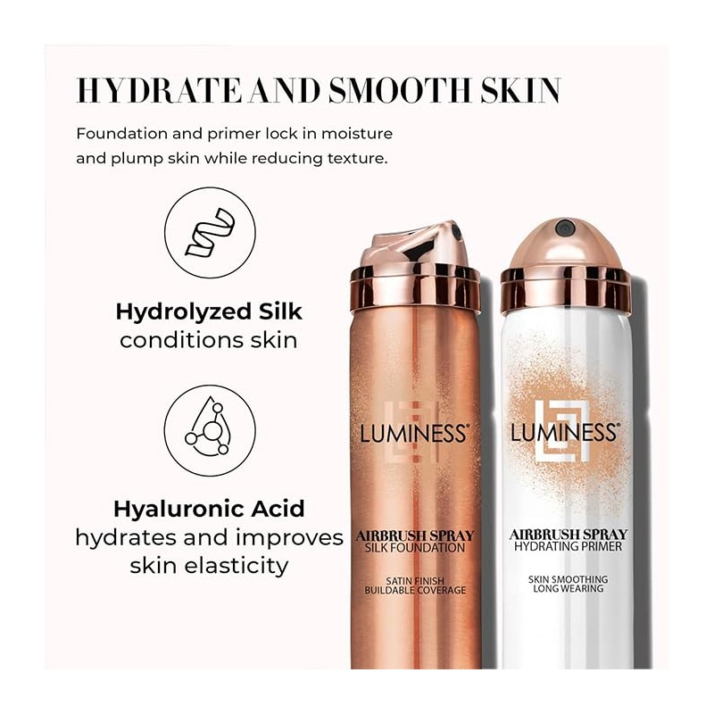 LUMINESS Silk Airbrush Spray Foundation 3-PC Kit - Foundation, Primer & Dual-Sided Makeup Brush - Buildable Coverage, Anti-Aging Formula, Humidity Resistant, Hydrates & Moisturizes, Light Medium