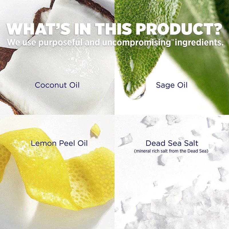 Active Ingredients: | Coconut Oil,Sage Oil,Lemon Peel,Dead Sea Salt |