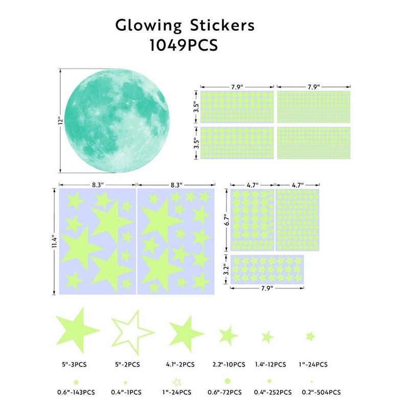 - Glow in the Dark Stickers: The wall stickers are made of high quality environmentally friendly PVC material, durable Color: bright green during the day and fluorescent blue at night Quantity: about 1049pcs/set