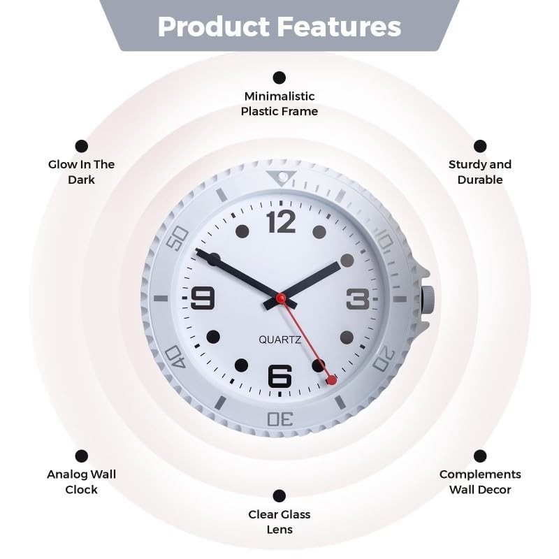 - Crafted with a sleek plastic frame and adorned with a crystal-clear glass lens, our office wall clock exudes elegance from every angle.