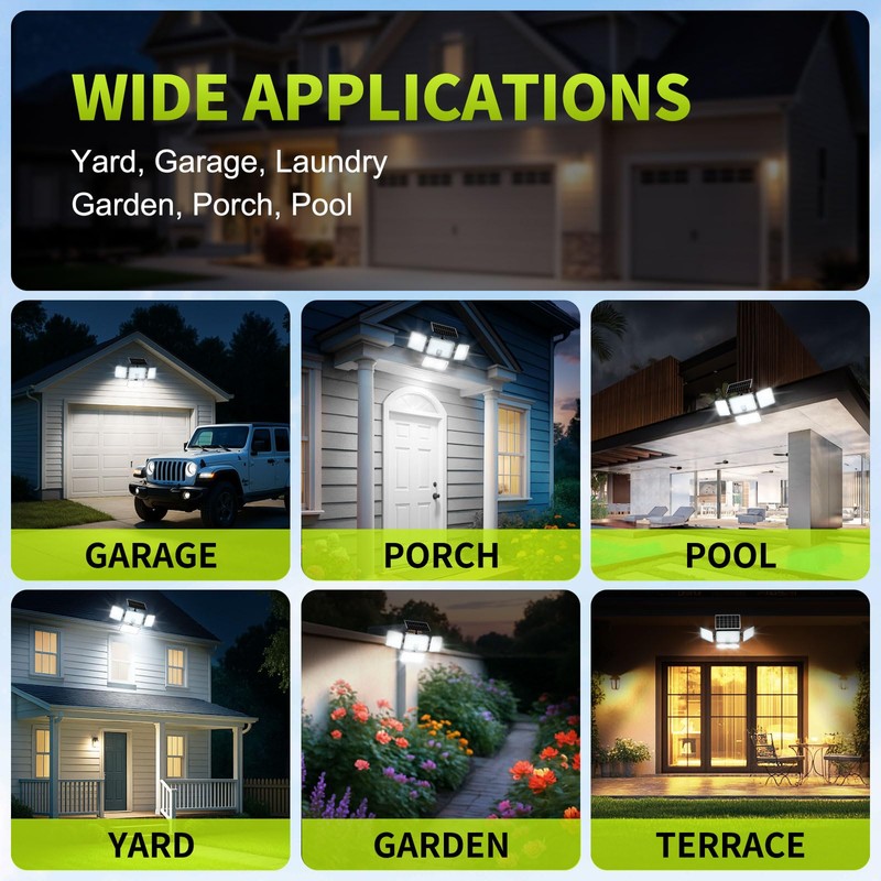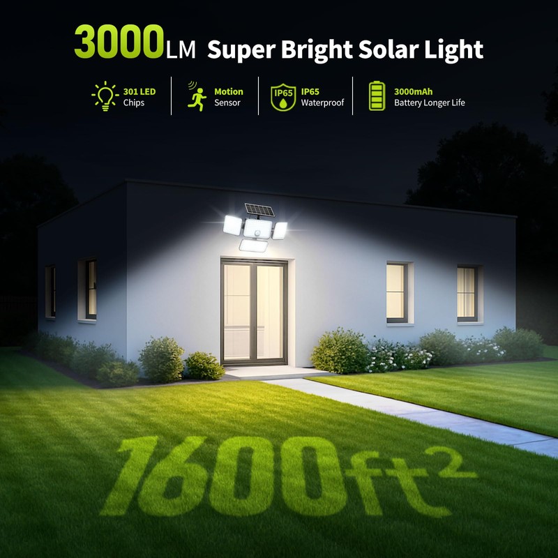 - 【4-HEAD DESIGN AND WIDER ILLUMINATION AREA】 This solar motion lights outdoor is designed with creative four-head design, that detecting a wide illumination angle of up to 270 degrees and a sensing distance of 25ft, providing extra brightness and a wider visible area, ensuring that sunlight is absorbed to the maximum at every corner.