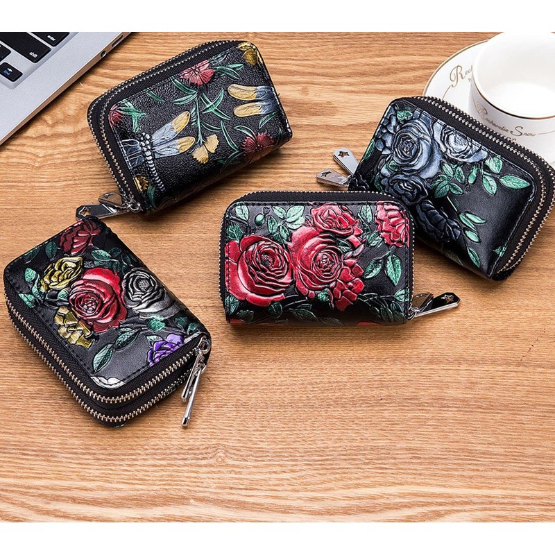 LUMoony Women's Leather Double Zip Multiple Compartments Coin Bag Purse with RFID Protection Large Capacity Genuine Leather Purse Clutch Purse Coin Bag Flowers Colourful