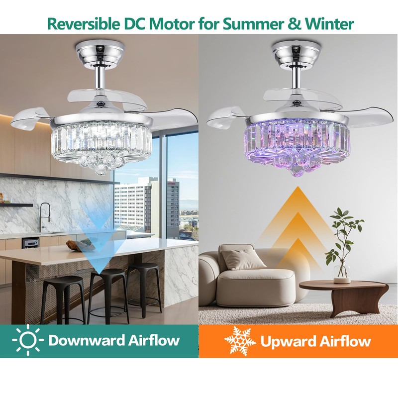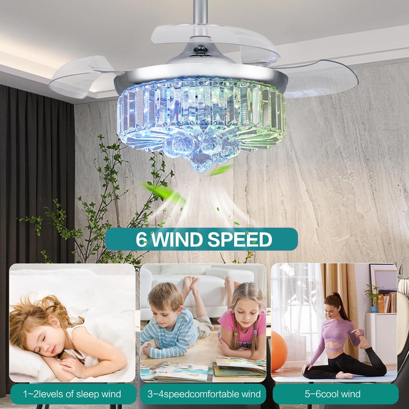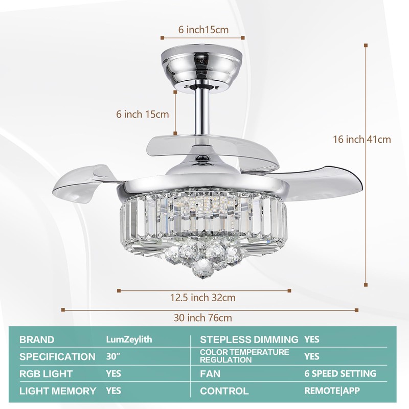 LumZeylith 30" Retractable Crystal Ceiling Fan with Light, RGB Modern Fandelier 6 Speeds Reversible Blades Dimmable Remote App Control Memory Timer Silver
