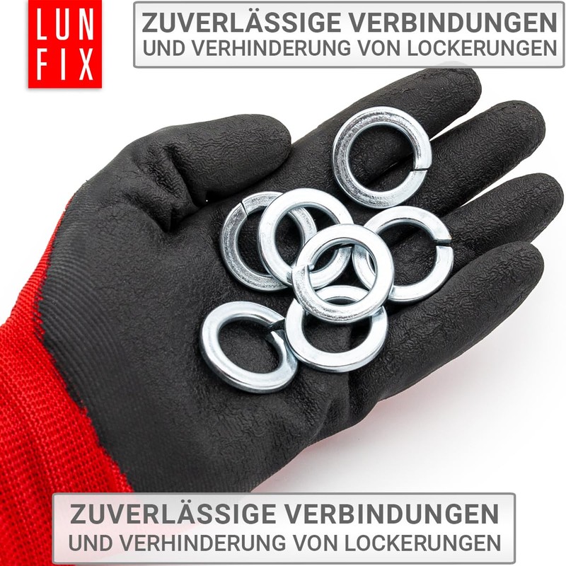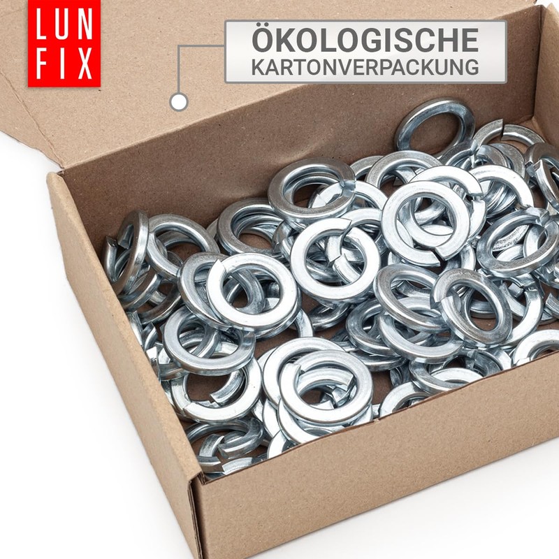 - Corrosion protection: Lun Fix spring washers are covered with a zinc layer, which provides high corrosion protection. This significantly extends its service life under normal humidity and low corrosion influences. Thanks to the use of high-quality galvanised steel, our spring rings are rust and oxidation resistant. However, we recommend that you only use them indoors or in protected outdoor areas.