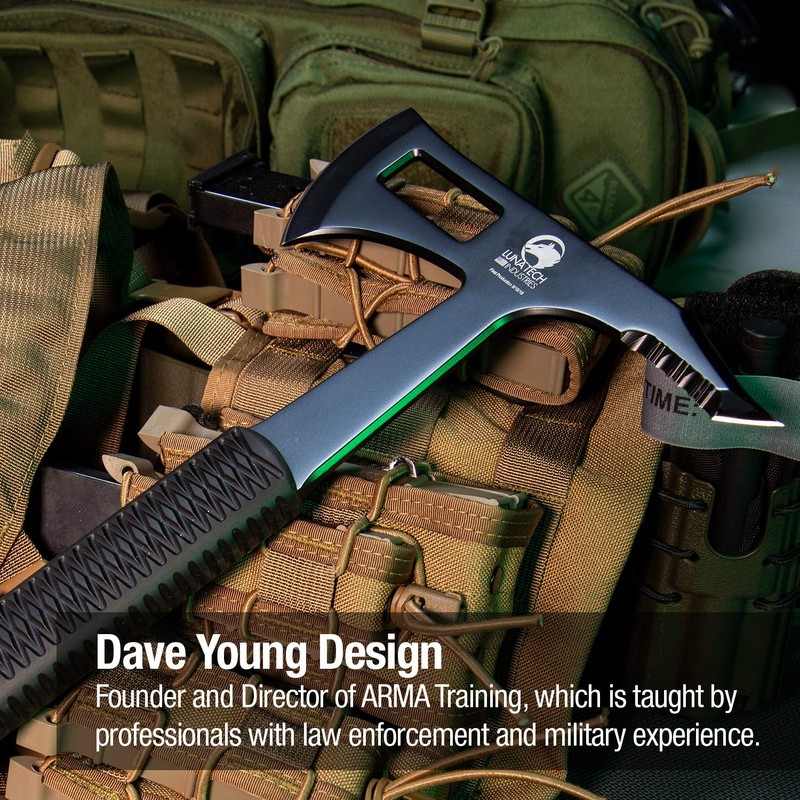 Luna Tech, LTK9501, Dave Young Combat Breaching Tool, 16.75in. Full Length Tang Tomahawk, TPR Handle, Includes Black Sheath with MOLLE System