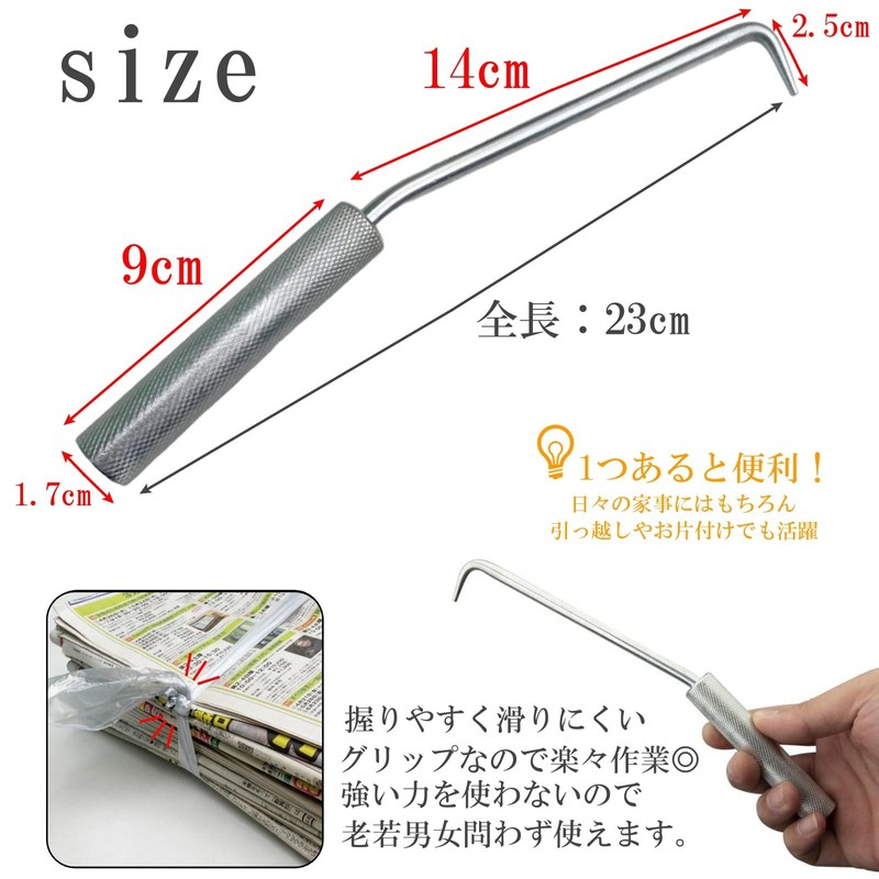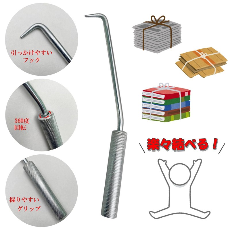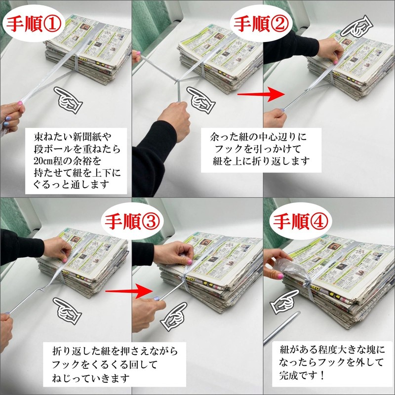 - How to Use: 1. Simply stack the newspapers or cardboard you want to bundle up and down with a 7.9 inches (20 cm) margin of space. 2-1. Hook the hook around the center of the excess string and fold the string back up. ③-Hold the folded string and turn the hook around and twist. 4. If you twist a few times, the string will become a bun and you can remove the hook when it gets to a certain extent