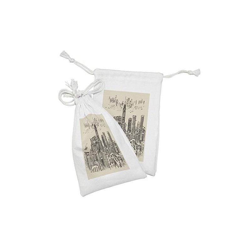Lunarable City Fabric Pouch Set of 2, Hong Kong Sketch Drawn Skyscrapers Architecture Metropolitan Cityscape Urban Tourism, Small Drawstring Bag for Toiletries Masks and Favors, 9" x 6", Beige Taupe