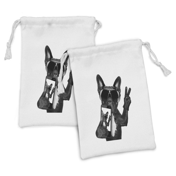 Lunarable Funny Fabric Pouch Set of 2, French Bulldog Taking a Selfie Cool Sunglasses Humor Pets Funny Portrait, Small Drawstring Bag for Toiletries Masks and Favors, 9" x 6", Charcoal Grey and White